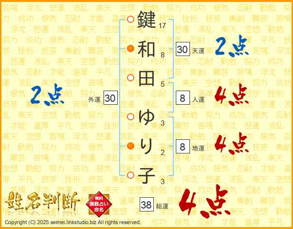 鍵和田ゆり子さんの総運は38画の4点!