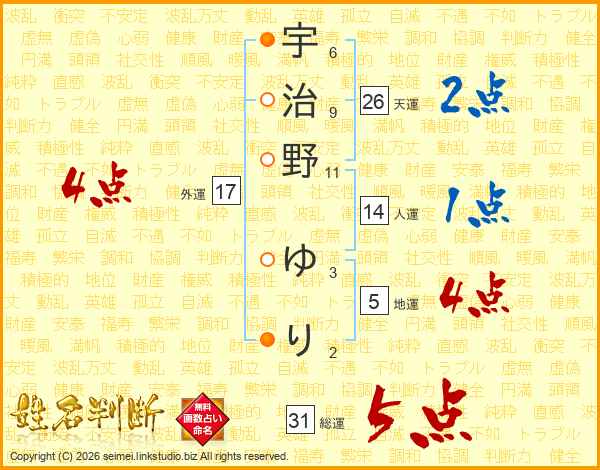宇(6画)治(9画)野(11画) ゆ(3画)り(2画)