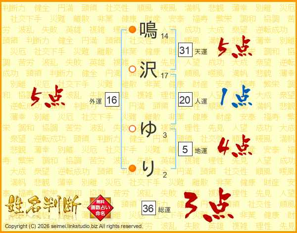 鳴沢ゆりさんの外運は16画の5点!