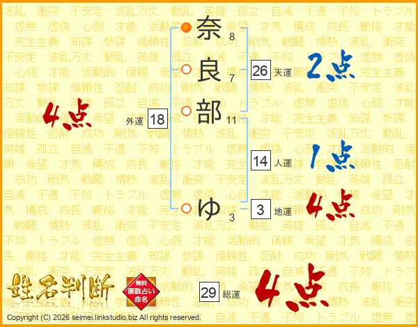 奈(8画)良(7画)部(11画) ゆ(3画)