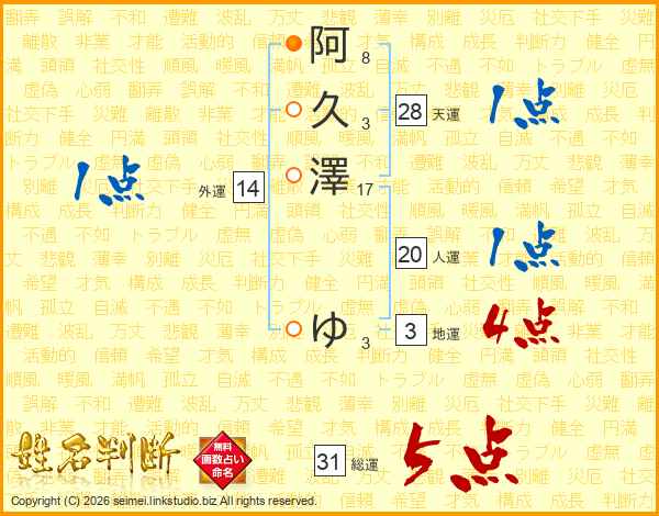 阿久澤ゆさんの総運は31画の5点!