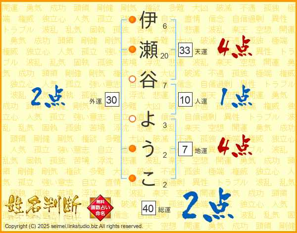 伊(6画)瀬(20画)谷(7画) よ(3画)う(2画)こ(2画)