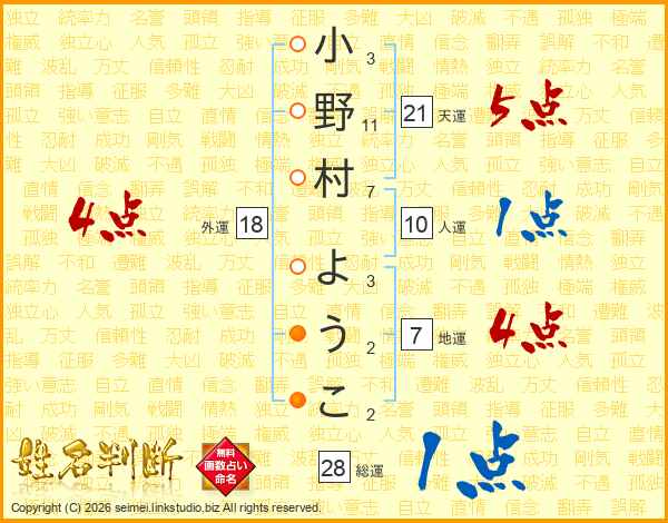 生活面を象徴する運勢です。外部から受ける影響力を表し、結婚運、家庭運や職場、環境への順応性を表します。総運から人運を引いた画数。姓や名が1文字の場合を除く。