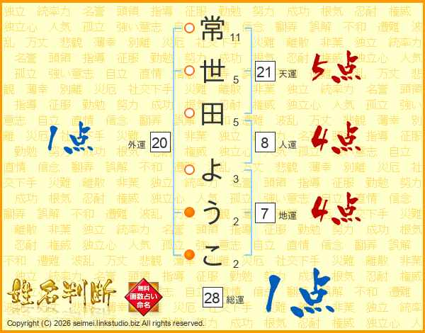 生活面を象徴する運勢です。外部から受ける影響力を表し、結婚運、家庭運や職場、環境への順応性を表します。総運から人運を引いた画数。姓や名が1文字の場合を除く。