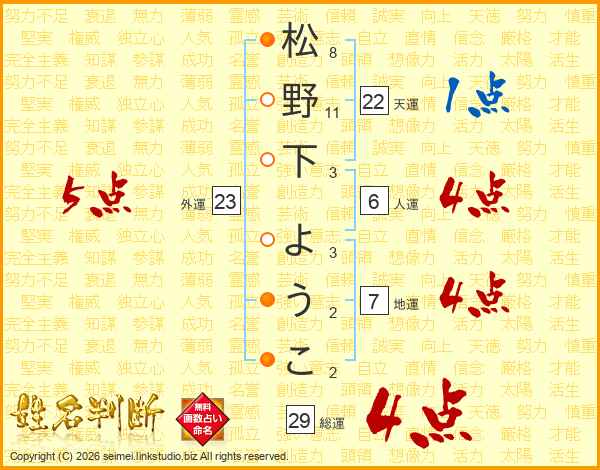 生活面を象徴する運勢です。外部から受ける影響力を表し、結婚運、家庭運や職場、環境への順応性を表します。総運から人運を引いた画数。姓や名が1文字の場合を除く。