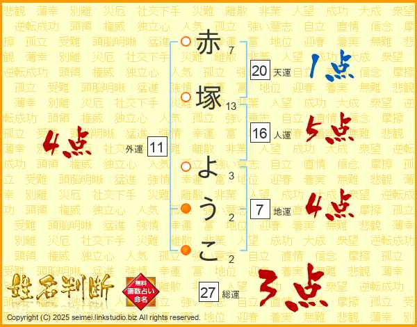 生活面を象徴する運勢です。外部から受ける影響力を表し、結婚運、家庭運や職場、環境への順応性を表します。総運から人運を引いた画数。姓や名が1文字の場合を除く。