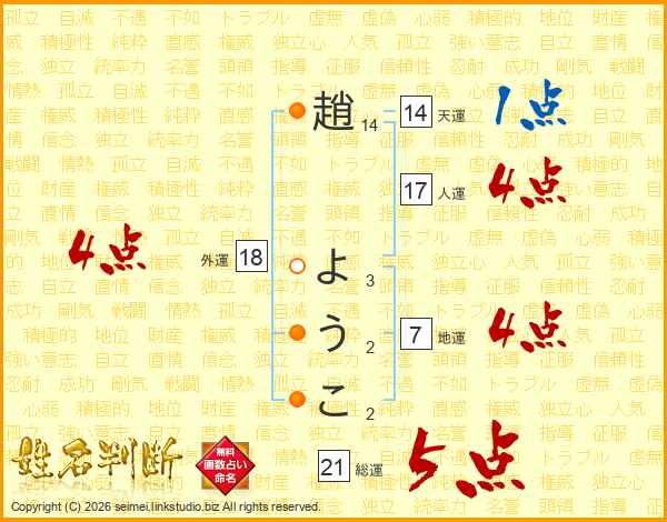 生活面を象徴する運勢です。外部から受ける影響力を表し、結婚運、家庭運や職場、環境への順応性を表します。総運から人運を引いた画数。姓や名が1文字の場合を除く。