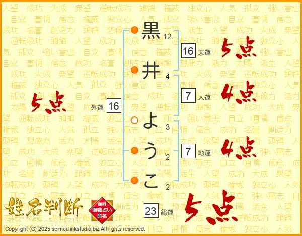 あなたの人生を表す1番重要な運勢です。生涯を通じて影響する総合運となり、主に50歳以降の晩年期に影響を及ぼします。苗字と名前の合計画数。