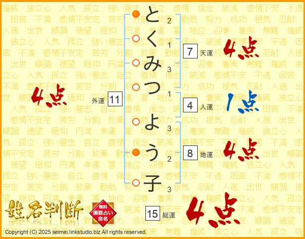 生活面を象徴する運勢です。外部から受ける影響力を表し、結婚運、家庭運や職場、環境への順応性を表します。総運から人運を引いた画数。姓や名が1文字の場合を除く。