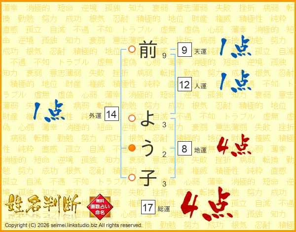生活面を象徴する運勢です。外部から受ける影響力を表し、結婚運、家庭運や職場、環境への順応性を表します。総運から人運を引いた画数。姓や名が1文字の場合を除く。