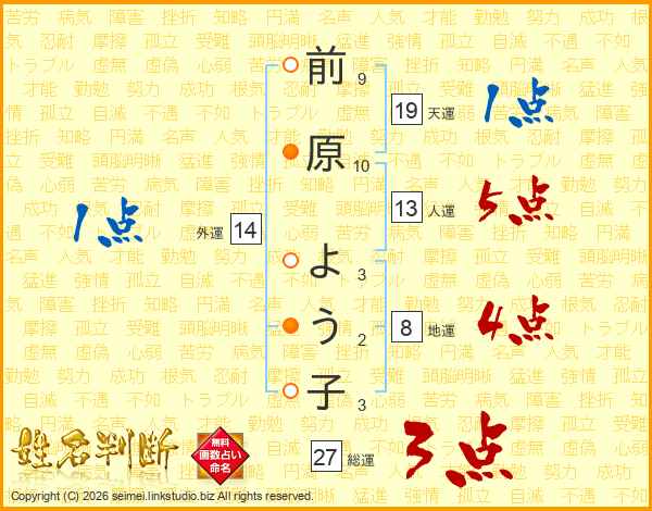 生活面を象徴する運勢です。外部から受ける影響力を表し、結婚運、家庭運や職場、環境への順応性を表します。総運から人運を引いた画数。姓や名が1文字の場合を除く。