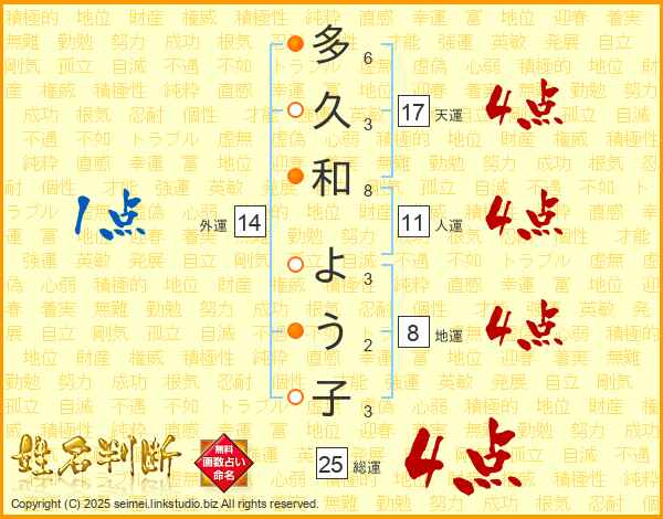 多久和よう子さんの総運は25画の4点!