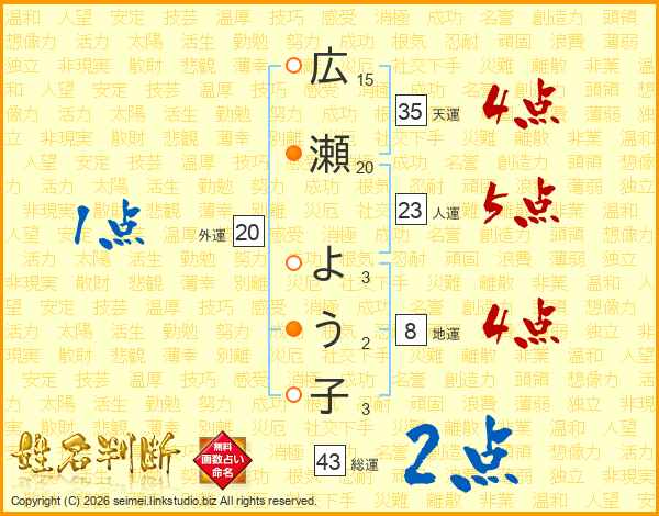 広(15画)瀬(20画) よ(3画)う(2画)子(3画)
