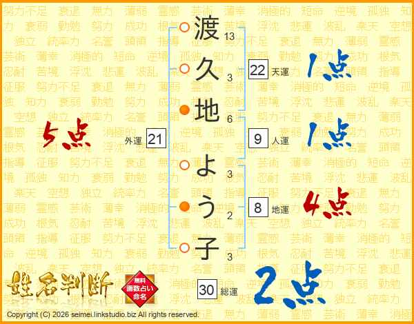 渡(13画)久(3画)地(6画) よ(3画)う(2画)子(3画)
