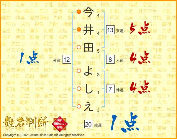 今(4画)井(4画)田(5画) よ(3画)し(1画)え(3画)