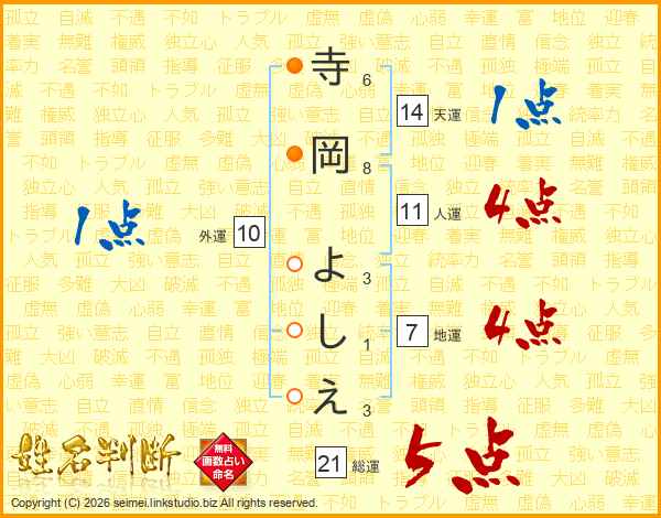 寺岡よしえさんの総運は21画の5点!