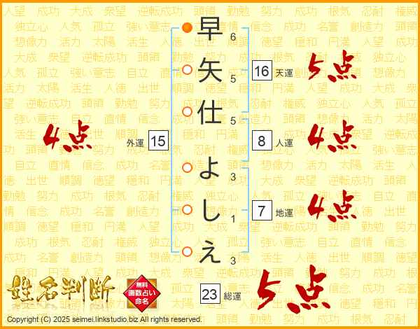 生活面を象徴する運勢です。外部から受ける影響力を表し、結婚運、家庭運や職場、環境への順応性を表します。総運から人運を引いた画数。姓や名が1文字の場合を除く。