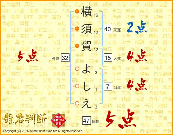 横(16画)須(12画)賀(12画) よ(3画)し(1画)え(3画)