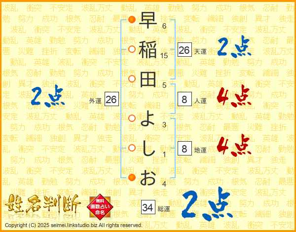 早(6画)稲(15画)田(5画) よ(3画)し(1画)お(4画)