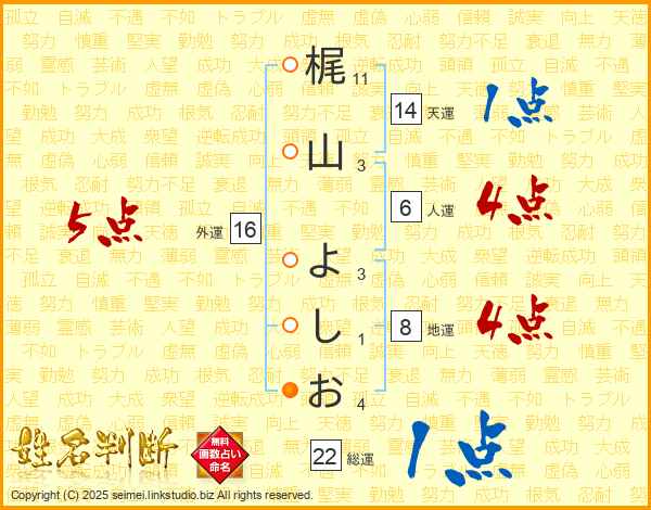 梶(11画)山(3画) よ(3画)し(1画)お(4画)