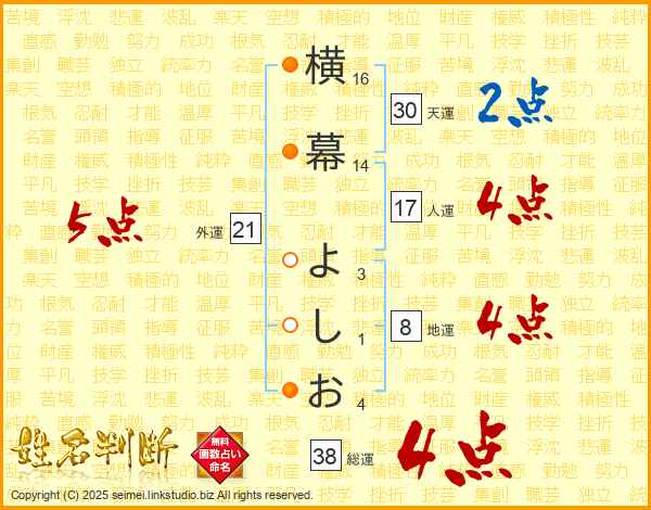 横幕よしおさんの総運は38画の4点!