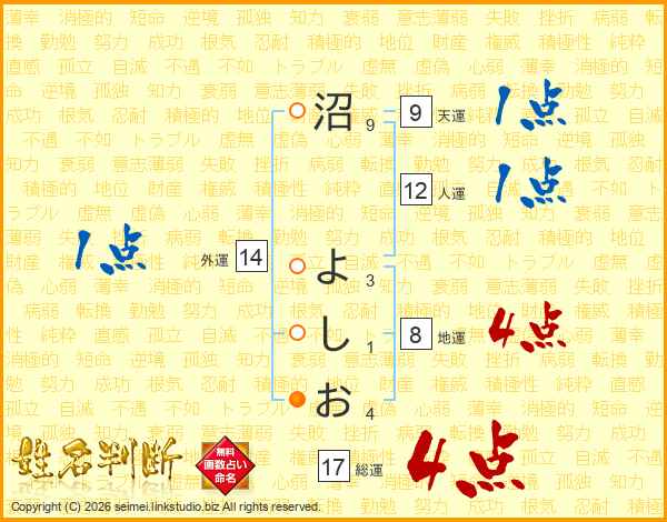 生活面を象徴する運勢です。外部から受ける影響力を表し、結婚運、家庭運や職場、環境への順応性を表します。総運から人運を引いた画数。姓や名が1文字の場合を除く。