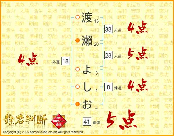 渡(13画)瀨(20画) よ(3画)し(1画)お(4画)