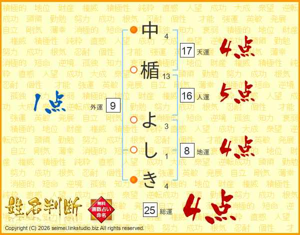 生活面を象徴する運勢です。外部から受ける影響力を表し、結婚運、家庭運や職場、環境への順応性を表します。総運から人運を引いた画数。姓や名が1文字の場合を除く。