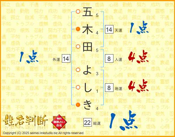 生活面を象徴する運勢です。外部から受ける影響力を表し、結婚運、家庭運や職場、環境への順応性を表します。総運から人運を引いた画数。姓や名が1文字の場合を除く。