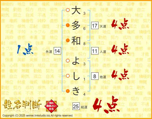 生活面を象徴する運勢です。外部から受ける影響力を表し、結婚運、家庭運や職場、環境への順応性を表します。総運から人運を引いた画数。姓や名が1文字の場合を除く。