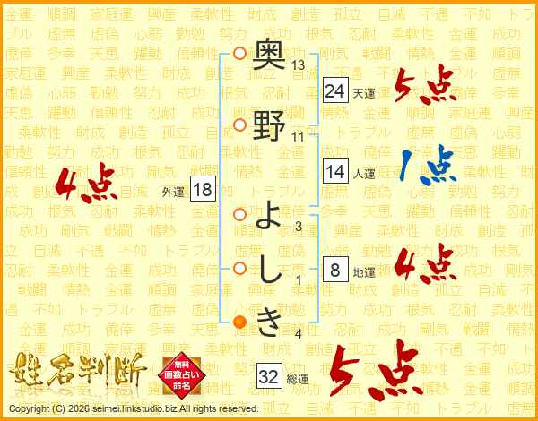 奥野よしきさんの総運は32画の5点!