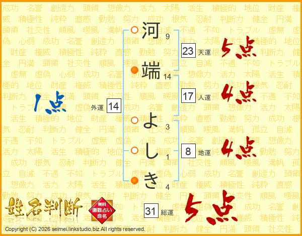 河端よしきさんの総運は31画の5点!