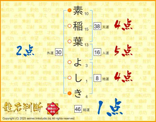 素(10画)稲(15画)葉(13画) よ(3画)し(1画)き(4画)