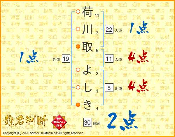 荷(11画)川(3画)取(8画) よ(3画)し(1画)き(4画)