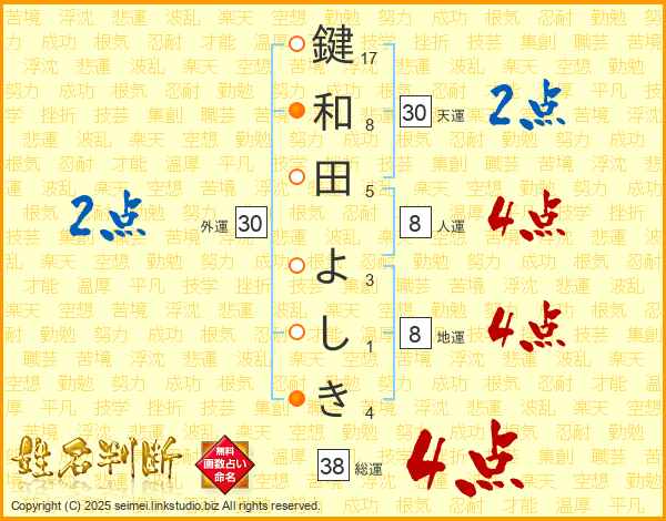 鍵和田よしきさんの総運は38画の4点!
