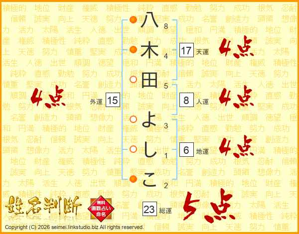 生活面を象徴する運勢です。外部から受ける影響力を表し、結婚運、家庭運や職場、環境への順応性を表します。総運から人運を引いた画数。姓や名が1文字の場合を除く。