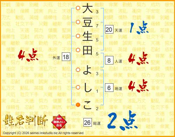 大豆生田よしこさんの総運は26画の2点!