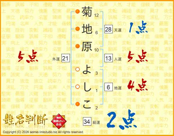 生活面を象徴する運勢です。外部から受ける影響力を表し、結婚運、家庭運や職場、環境への順応性を表します。総運から人運を引いた画数。姓や名が1文字の場合を除く。