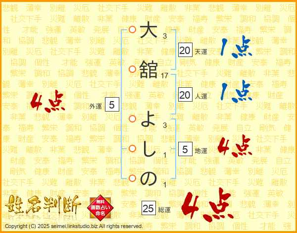 生活面を象徴する運勢です。外部から受ける影響力を表し、結婚運、家庭運や職場、環境への順応性を表します。総運から人運を引いた画数。姓や名が1文字の場合を除く。