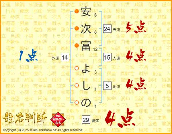 安(6画)次(6画)富(12画) よ(3画)し(1画)の(1画)