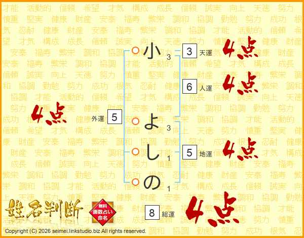 生活面を象徴する運勢です。外部から受ける影響力を表し、結婚運、家庭運や職場、環境への順応性を表します。総運から人運を引いた画数。姓や名が1文字の場合を除く。