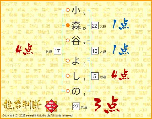 生活面を象徴する運勢です。外部から受ける影響力を表し、結婚運、家庭運や職場、環境への順応性を表します。総運から人運を引いた画数。姓や名が1文字の場合を除く。