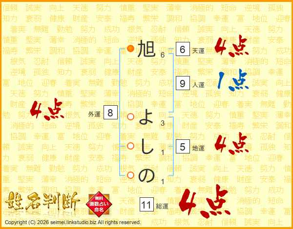 生活面を象徴する運勢です。外部から受ける影響力を表し、結婚運、家庭運や職場、環境への順応性を表します。総運から人運を引いた画数。姓や名が1文字の場合を除く。