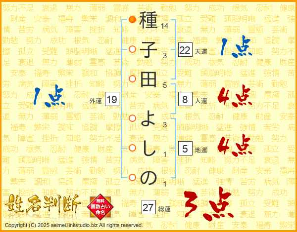 種(14画)子(3画)田(5画) よ(3画)し(1画)の(1画)