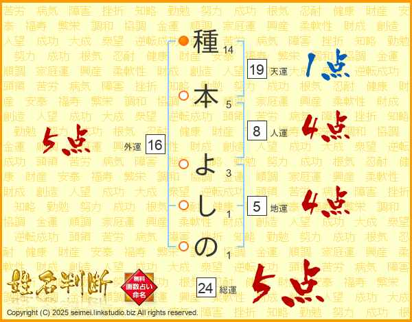 種(14画)本(5画) よ(3画)し(1画)の(1画)