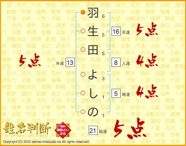 羽生田よしのさんの総運は21画の5点!