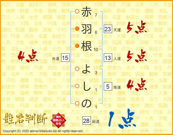 生活面を象徴する運勢です。外部から受ける影響力を表し、結婚運、家庭運や職場、環境への順応性を表します。総運から人運を引いた画数。姓や名が1文字の場合を除く。