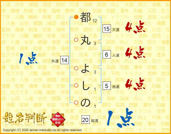 生活面を象徴する運勢です。外部から受ける影響力を表し、結婚運、家庭運や職場、環境への順応性を表します。総運から人運を引いた画数。姓や名が1文字の場合を除く。