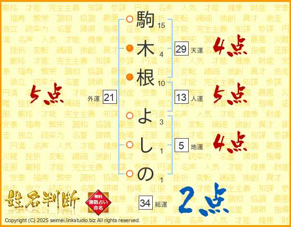 駒(15画)木(4画)根(10画) よ(3画)し(1画)の(1画)
