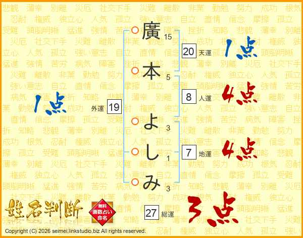 廣(15画)本(5画) よ(3画)し(1画)み(3画)